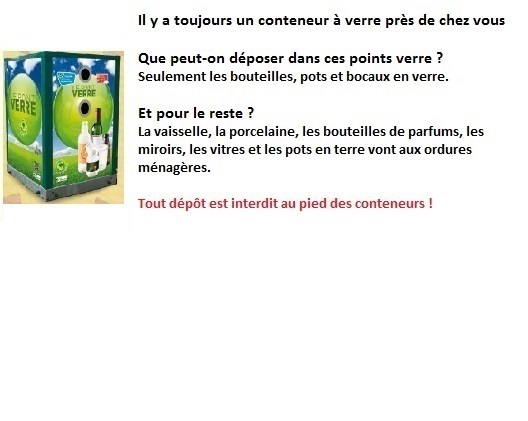 Les emballages recyclables en verre (pots, bouteilles, flacons) doivent être déposés sans bouchon ni couvercle, dans les conteneurs à verre.